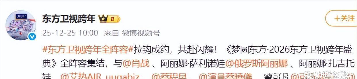 东方卫视跨年2025年12月25号上午10:00,发布消息:#东方卫视跨年全阵容#拉钩成约,共赴闪耀!《梦圆东方·2026东方卫视跨年盛典》全阵容集结
